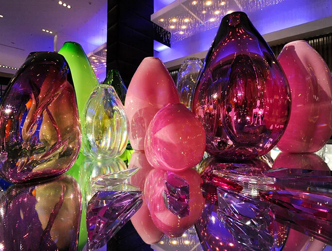 Hand-blown glass vessel installation with faceted RockGems